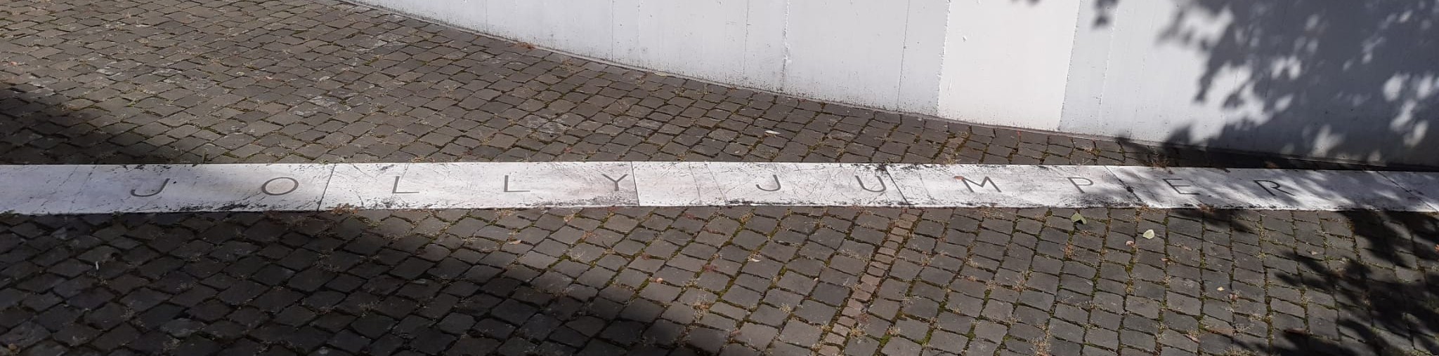 Ausschnitt Hof, Pferdename "Jolly Jumper" in einem marmornen Band