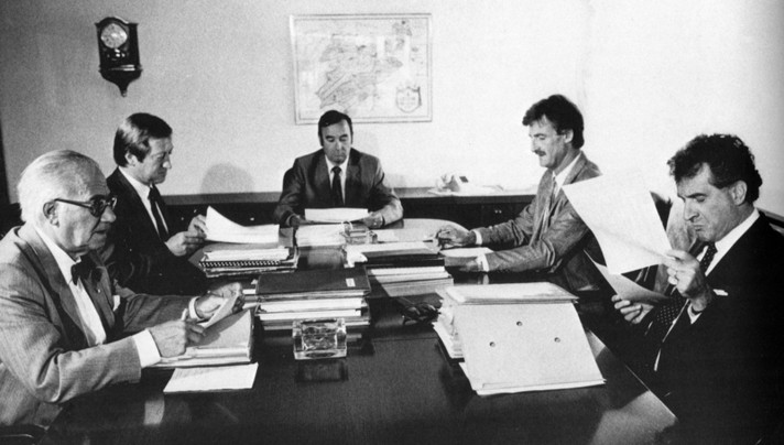 Das Regierungskollegium während der ersten beiden Legislaturen in der Geschichte von Republik und Kanton Jura: Roger Jardin, Pierre Boillat, François Mertenat, Jean-Pierre Beuret und François Lachat (Quelle: jura.ch).