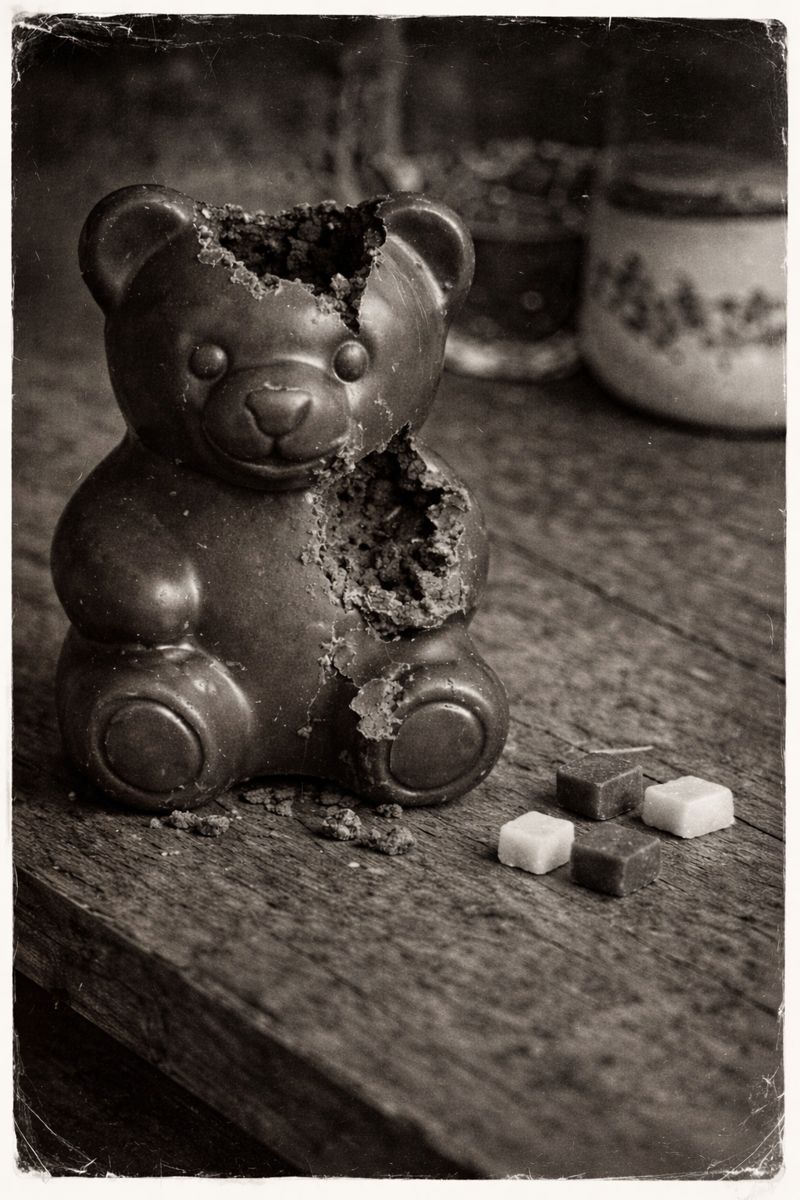 Ours en chocolat, avec pièces de massepain à côté. L'image est non datée, mais la sophistication de la confiserie pourrait indiquer que cette scène a été immortalisée dans la seconde moitié des années 1970. Tirage récent d'après négatif.