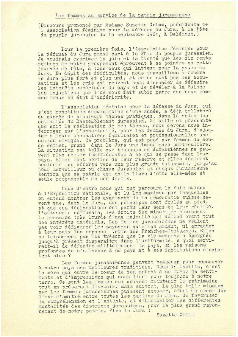 Côté politique, sphère dans laquelle les pionnières sont évidemment nombreuses, on peut penser à Chantal Bornoz Flück, première femme francophone présidente du Grand Conseil bernois, à Liliane Charmillot, première femme présidente du Parlement jurassien, à Marie-Madeleine Prongué, première jurassienne à siéger au Conseil des Etats, et bien sûr à Elisabeth Baume-Schneider, première personnalité jurassienne à siéger au Conseil fédéral. Le document illustrant la présente notice consacre lui aussi une « première » : il s'agit du discours prononcé à la Fête du peuple jurassien de 1964 par Suzette Grimm, première femme à prendre la parole à la tribune et première présidente de l'AFDJ.
